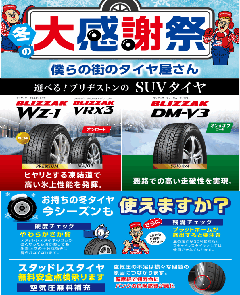 お買い得商品満載+新品タイヤ4本購入のお客様に、その場で当たるプレゼント!!